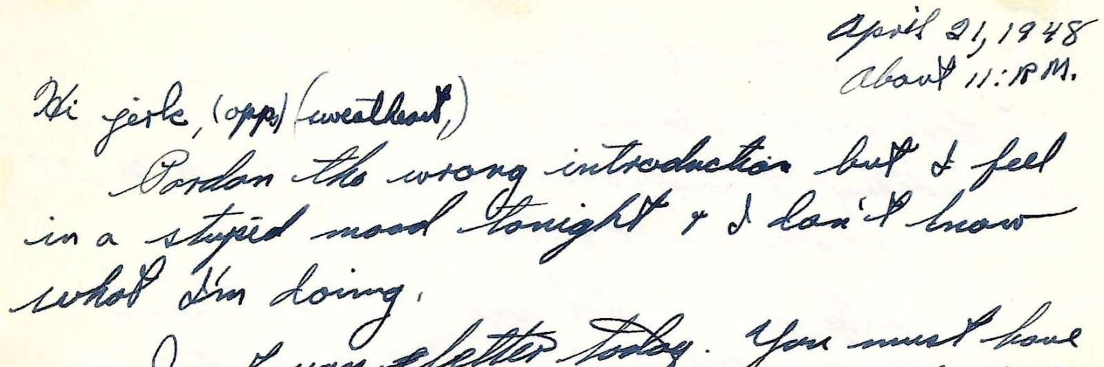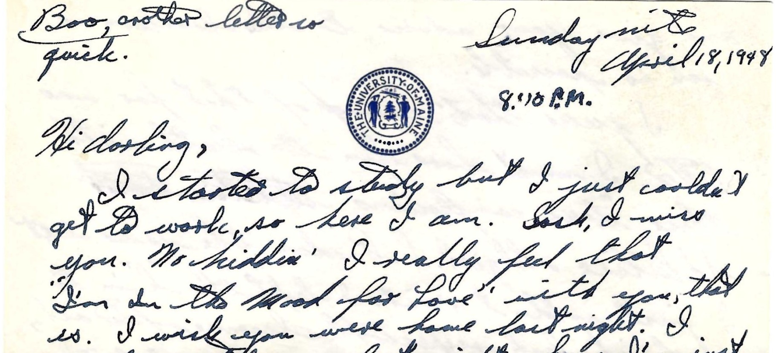 “It will be another week before I’ll see you so I have to depend on your letters to make life good again. That may sound silly, it probably is, but there is a lot of truth to it. Honest, kiddo, I really miss you and that’s no lie. “